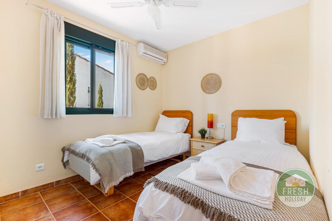 Esta casa o chalet con aire acondicionado consta de 3 dormitorios, una sala de estar, una cocina totalmente equipada con nevera y cafetera, y 2 baños con ducha y bañera. Hay toallas y ropa de cama en la casa o chalet.